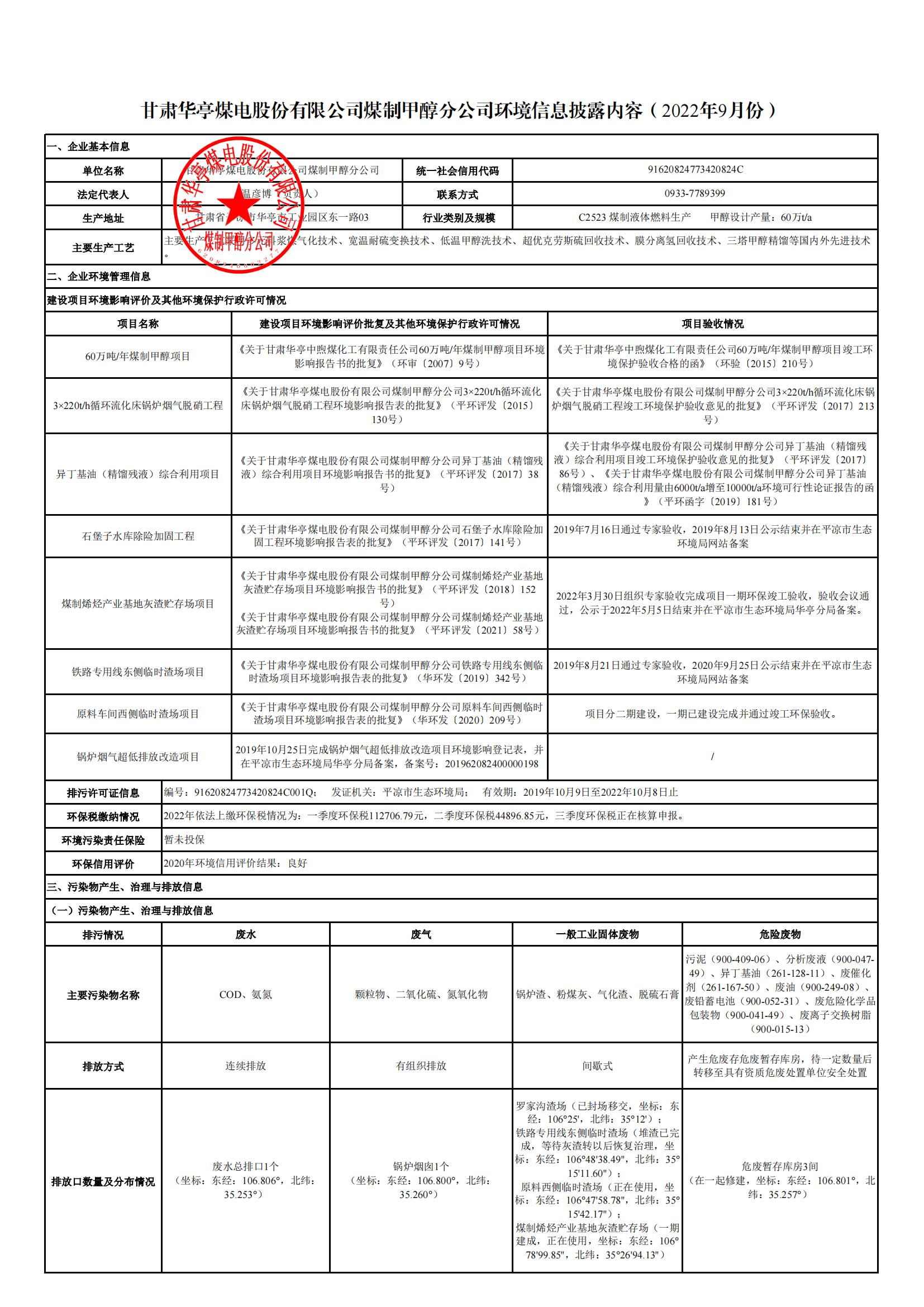 煤制甲醇分公司環(huán)境信息公開內(nèi)容(2022年9月)